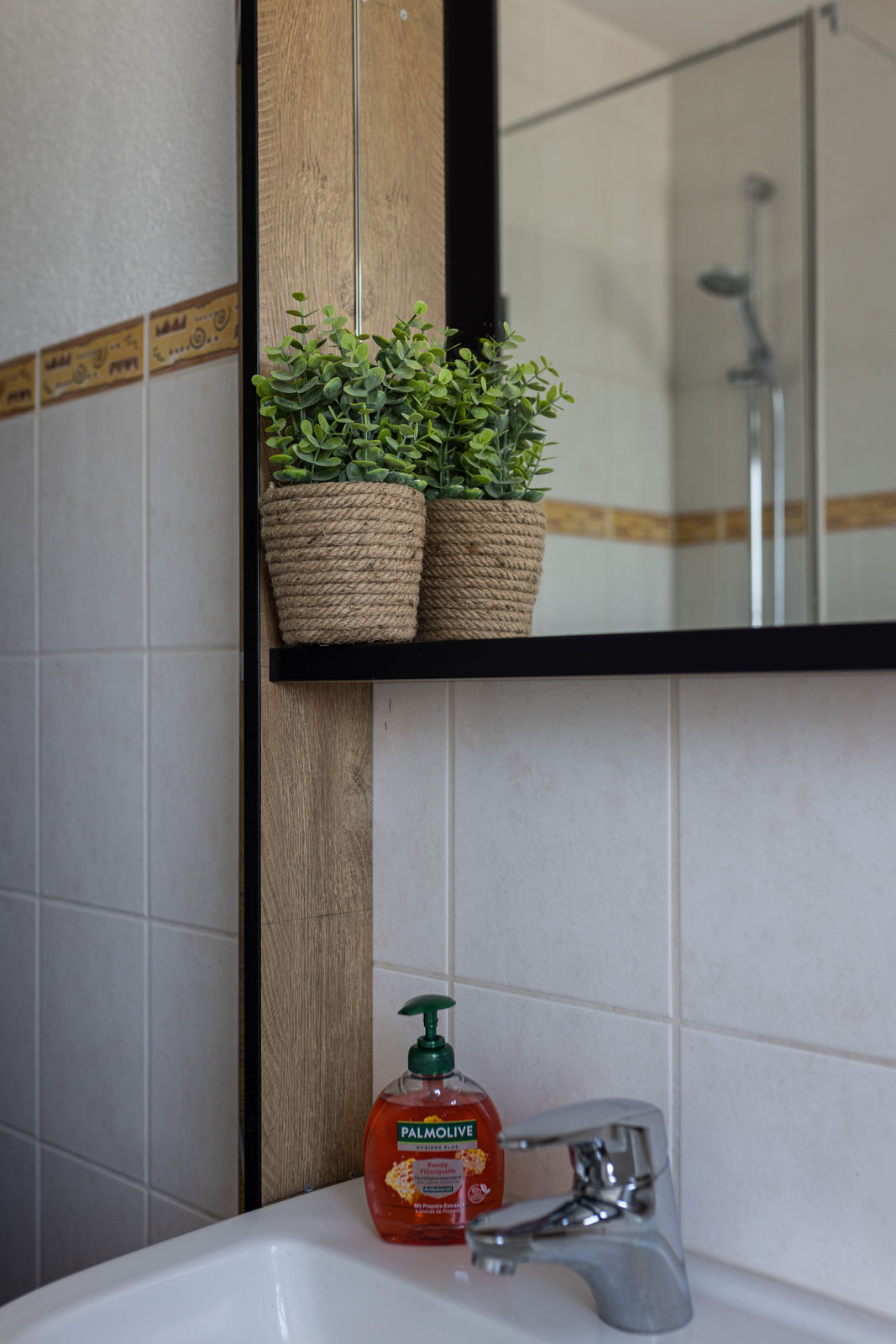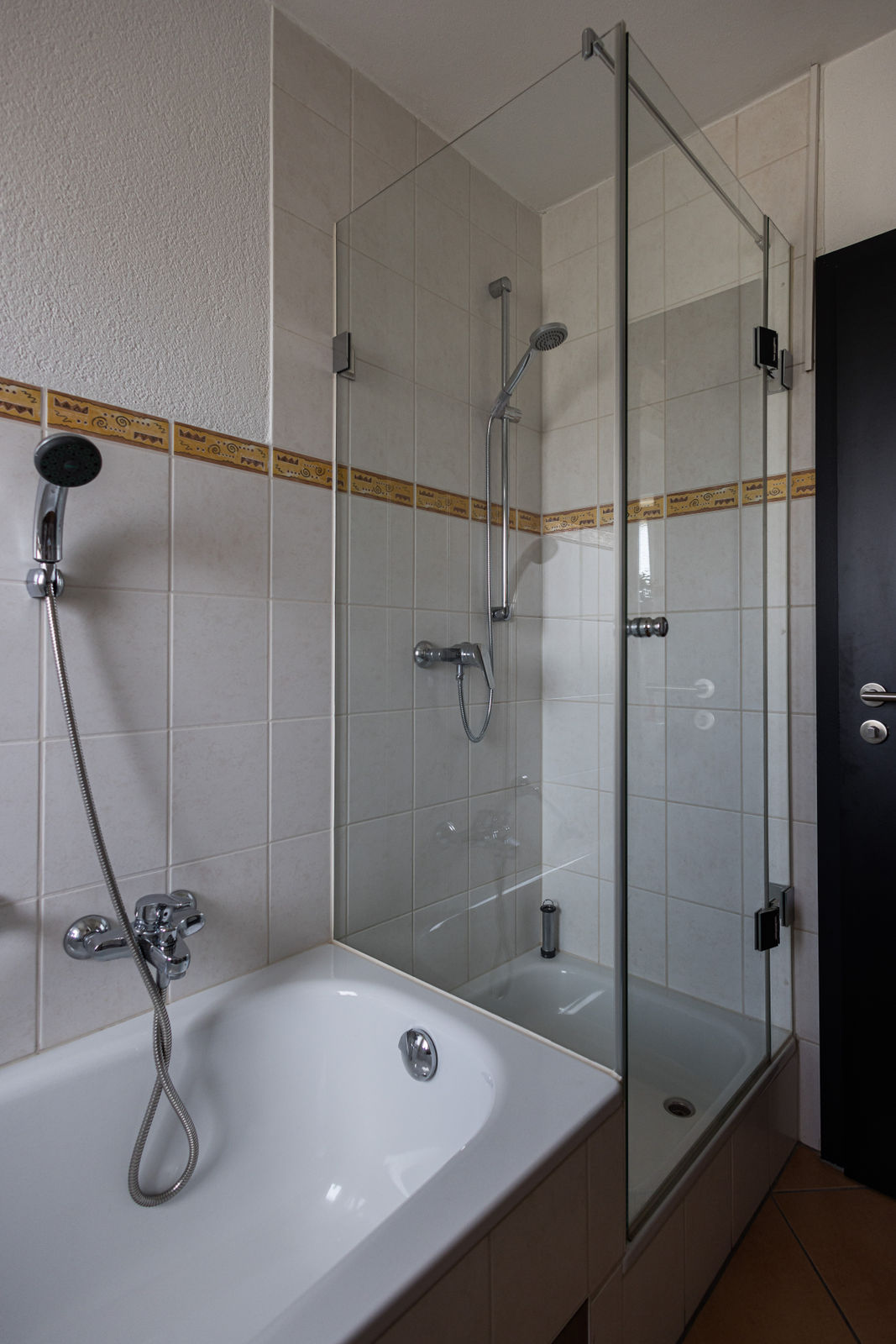 Das großzügige Badezimmer bietet sowohl eine erfrischende Dusche als auch eine entspannende Badewanne. Zur Ausstattung gehören ein WC, ein großer Spiegel sowie ein praktischer Fön.